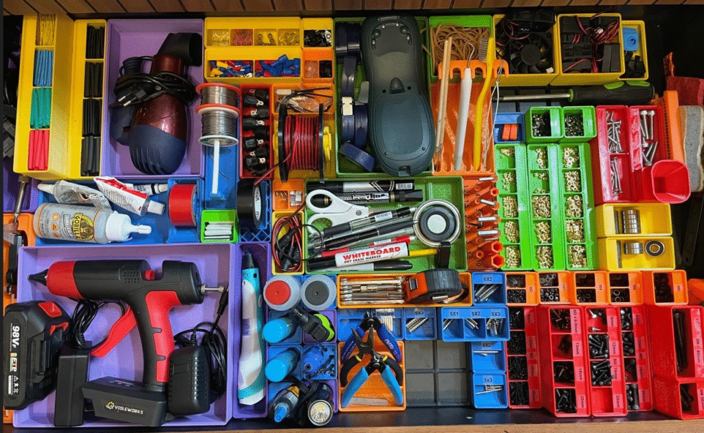 Gridfinity is a modular, open-source storage system designed around a simple grid standard. Everything snaps into a shared footprint, which means bins, trays, holders, and tools all play nicely together — even if they’re made by different people.