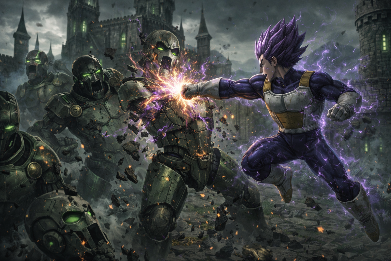 Vegeta blitzes. Doom’s armor takes the first impact—backward skid, cracked stone, a real shockwave. Doom feels it.