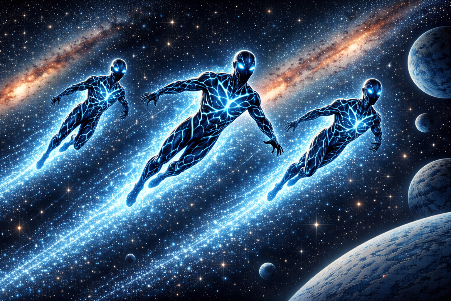 About two years ago, while riding the bus on an otherwise ordinary day, this concept came to me. I began imagining a space-faring species capable of traversing the cosmos without ships or technology—beings who absorb and channel natural cosmic energy to propel themselves between worlds.